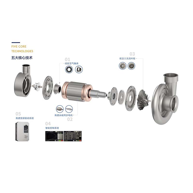 鼓風(fēng)機(jī)啟動(dòng)時(shí),軸承與軸接觸;當(dāng)達(dá)到起飛速度時(shí),軸承與軸不再接觸,無摩擦,轉(zhuǎn)子處于懸浮狀態(tài)。