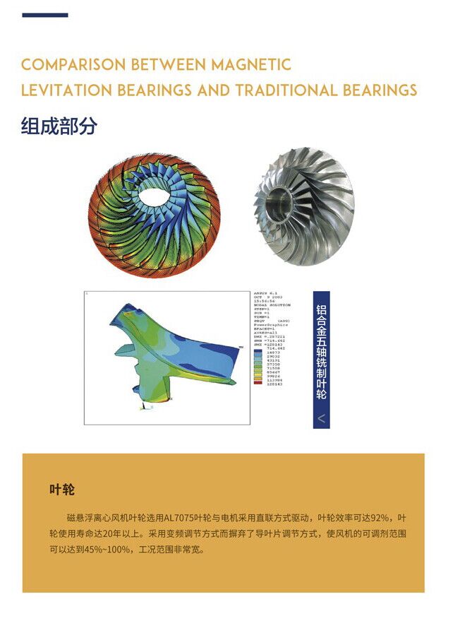 磁懸浮離心風機的葉輪采用AL7075鋁合金材質,通過與電機直接連接驅動。葉輪效率可達92%,使用壽命可達20年以上。風機轉速調節(jié)范圍可達45%~100%,工作范圍非常寬廣。