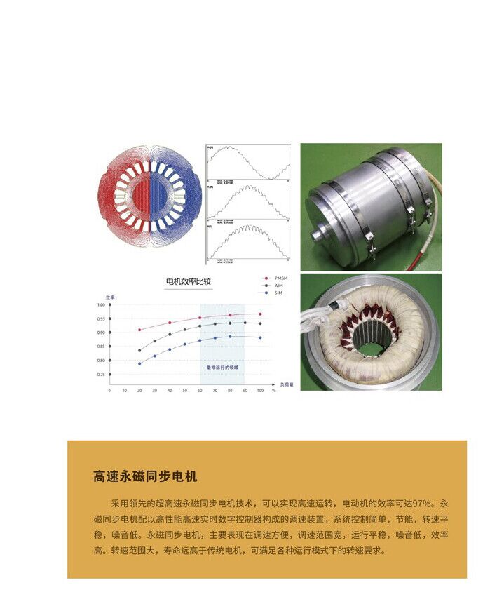 采用領先的超高速永磁同步電機技術,可實現(xiàn)高速運行,電機效率可達97.9%。永磁同步電機配備由高性能高速實時數(shù)字控制器組成的調速裝置。該系統(tǒng)具有控制簡便、節(jié)能、轉速穩(wěn)定、噪音低等優(yōu)點。永磁同步電機的主要特點是調速方便、調速范圍寬、運行穩(wěn)定、噪音低、效率高。其調速范圍大,使用壽命遠超傳統(tǒng)電機,能夠滿足各種運行模式下的轉速需求。